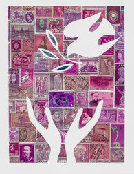 Through the monochromatic scheme of many stamps, I recreate postage stamp imagery by collaging dozens of stamps from around the world into a unified image.